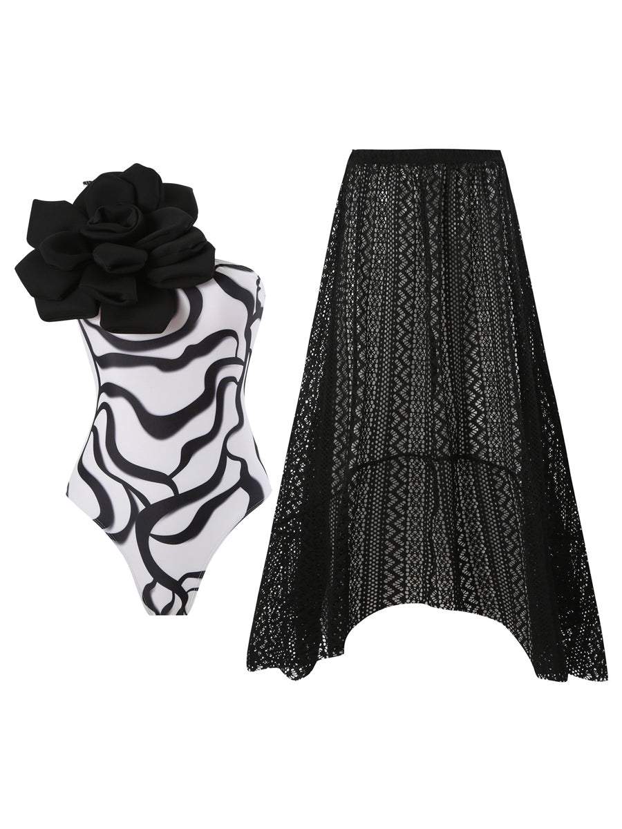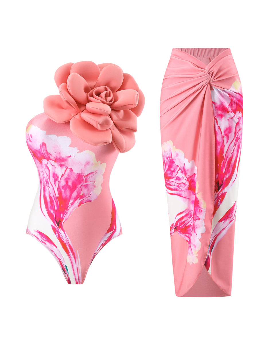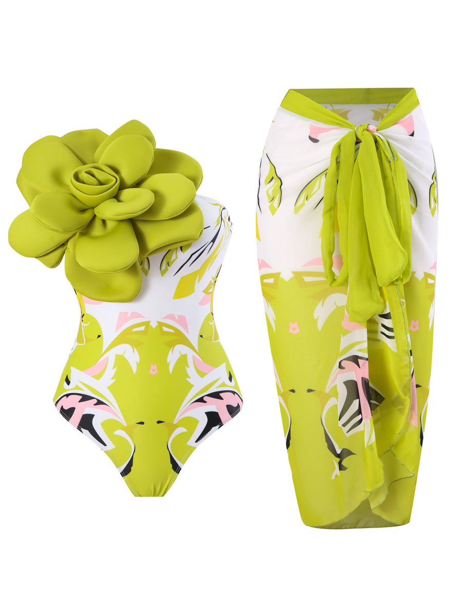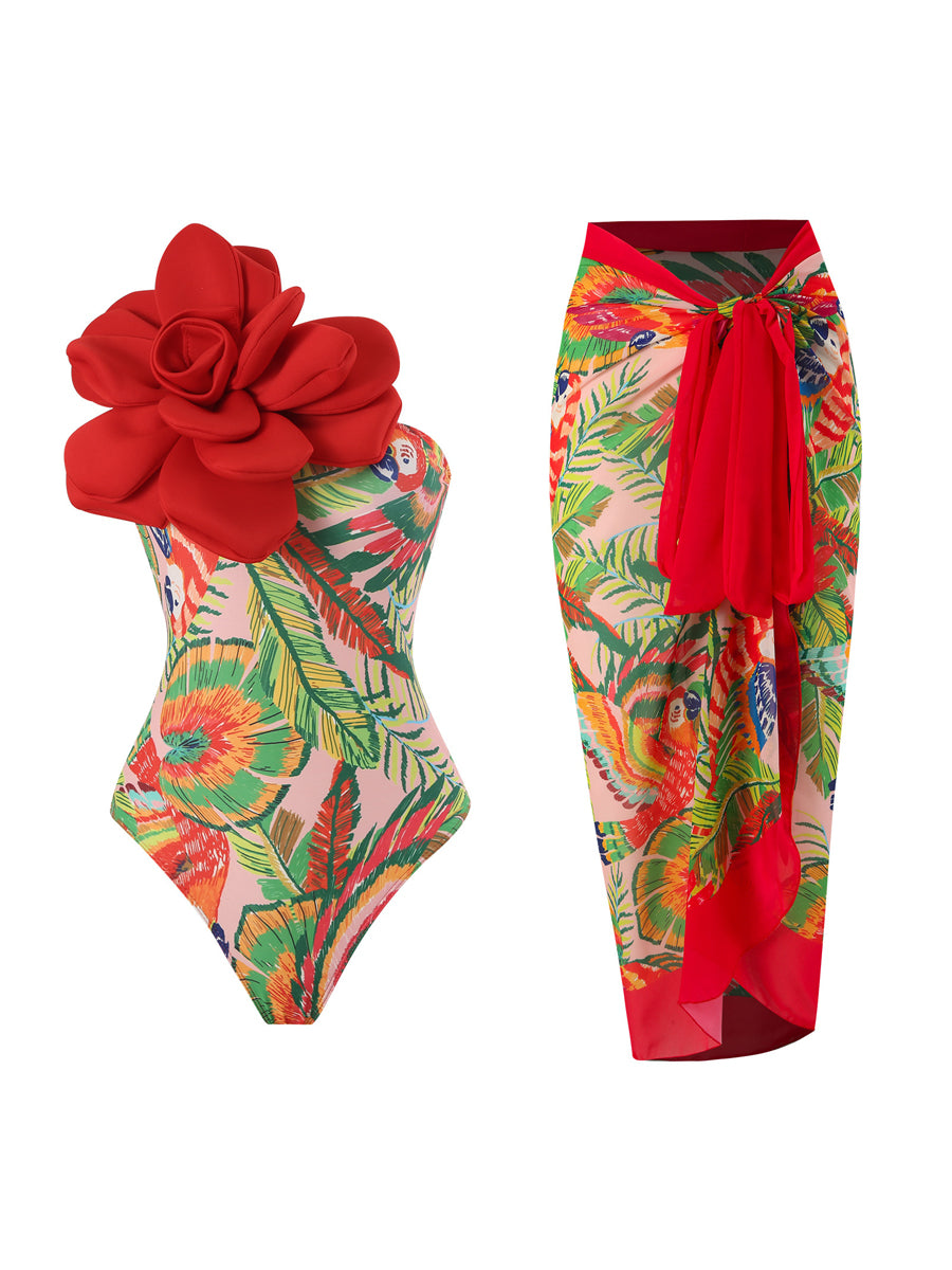3D Flower One Piece Swimsuit With Cover Up Set