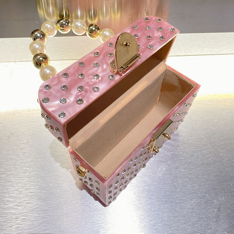 Add a touch of playful glamour to any outfit with this pink embellished box bag. Covered in sparkling rhinestones, it catches the light from every angle for a dazzling, party-ready look. The standout feature is the chunky pearl handle, paired with gold-tone hardware for a chic, retro-meets-modern vibe. A secure clasp keeps your essentials safe, while its compact silhouette makes it perfect for evenings out or statement-daywear.