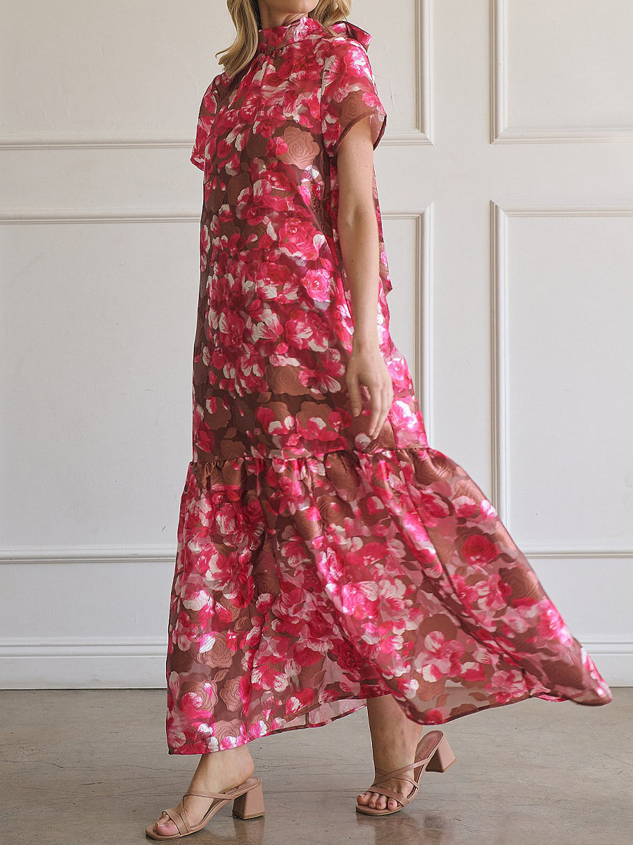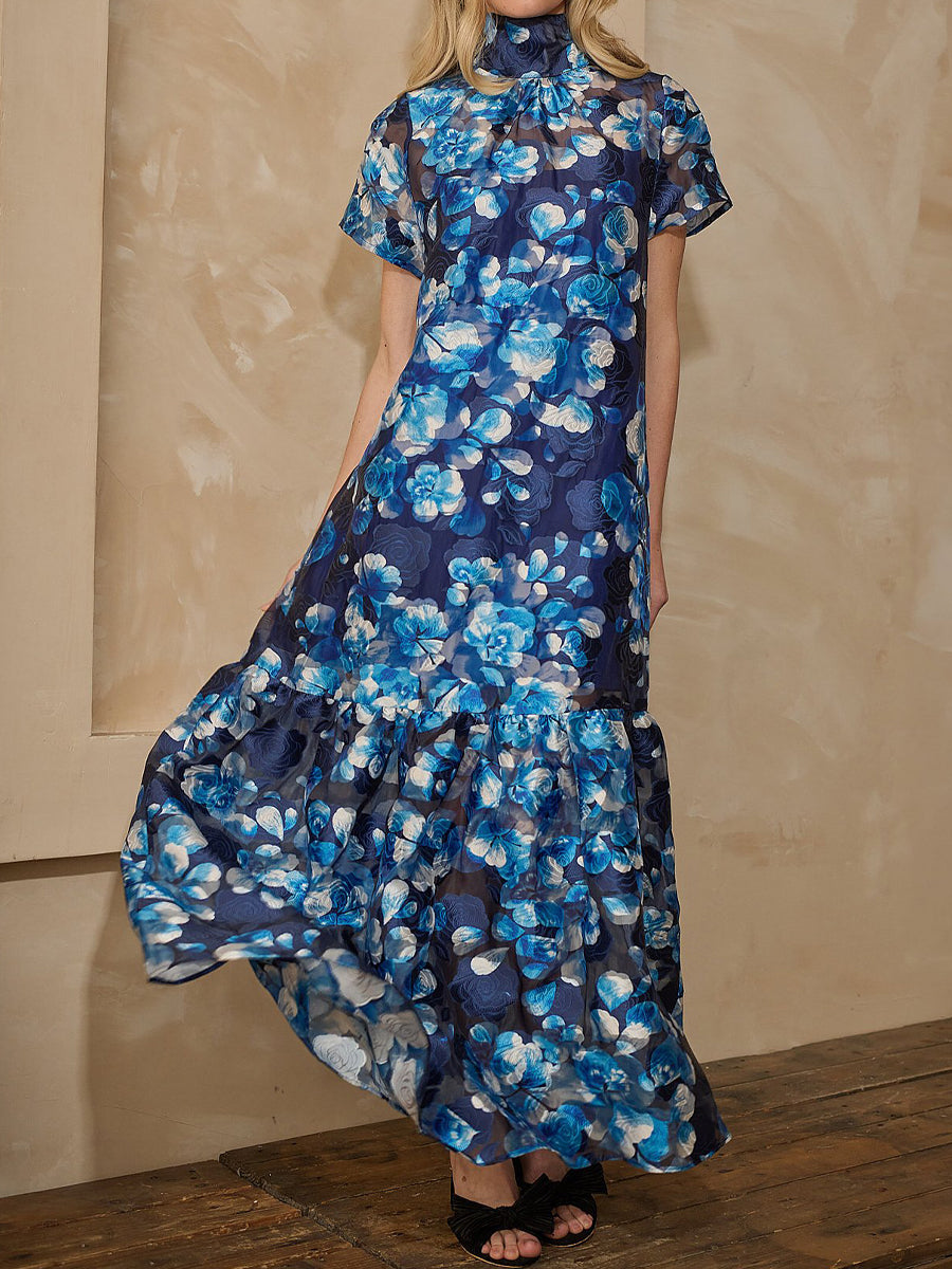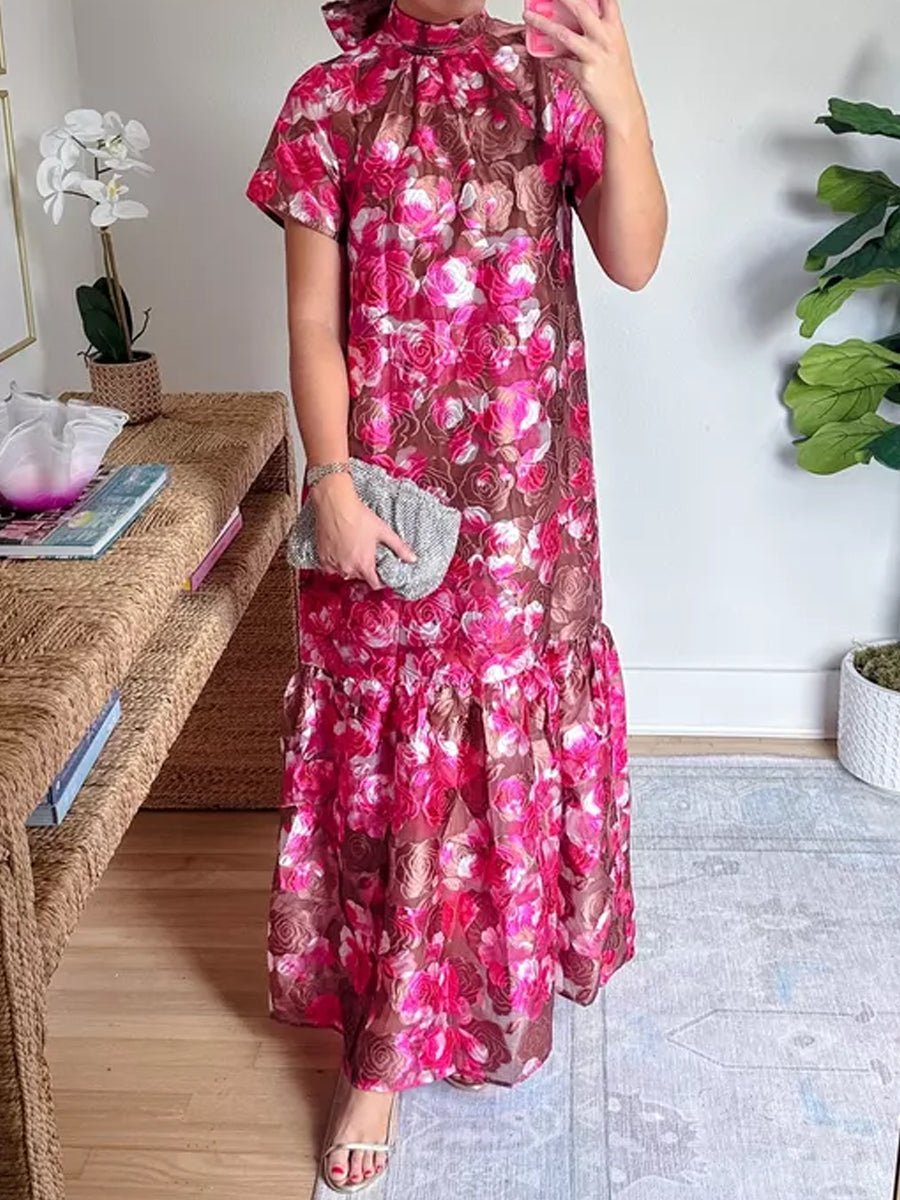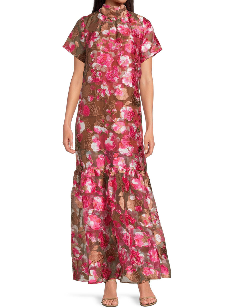 Floral Jacquard Mock Neck Tiered Hem Maxi Dress
