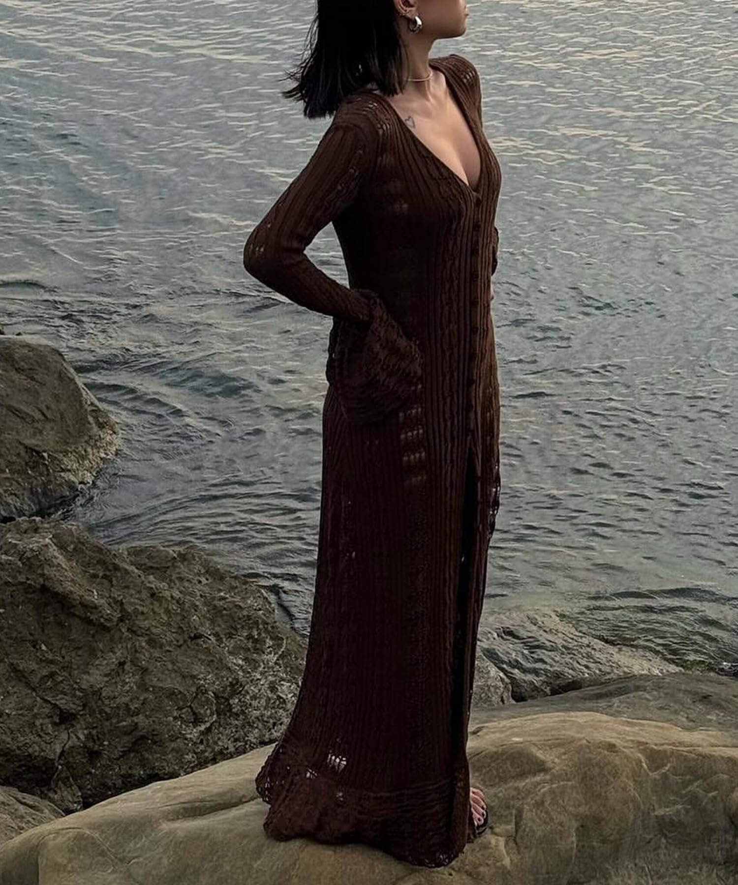 Hollow Out Knitted V Neck Long Sleeve Button Up Crochet Cardigans For Women