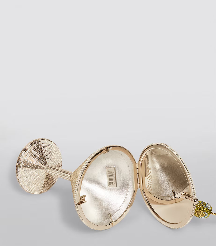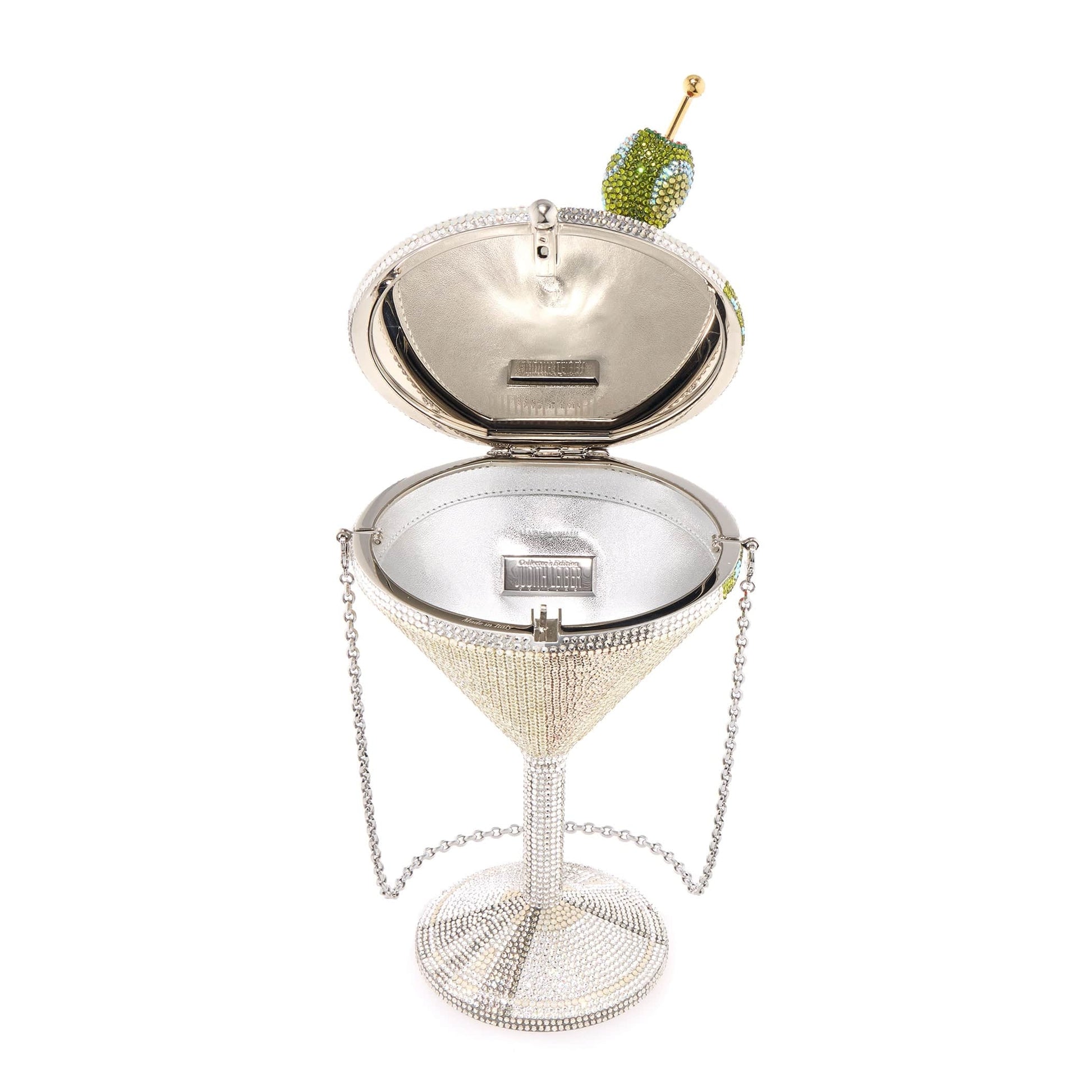 Explore the Martini bag—a sculptural wonder draped in a cascade of glimmering silver and champagne crystals, where the warm welcome of green sparkling olives impresses with a bold touch of crimson. A serenade to mixology perfection, our Martini purse exquisitely mirrors the iconic silhouette of the classic cocktail glass. Stir up the spirit in relaxed gatherings or starry twilight parties as you raise a toast to this conversation piece, all poised to declare its presence. Open the accessory and you'll find that indiscreet touch-ups are a thing of the past – the silhouette holds your favourite lipstick perfectly and even supplies a mirror.