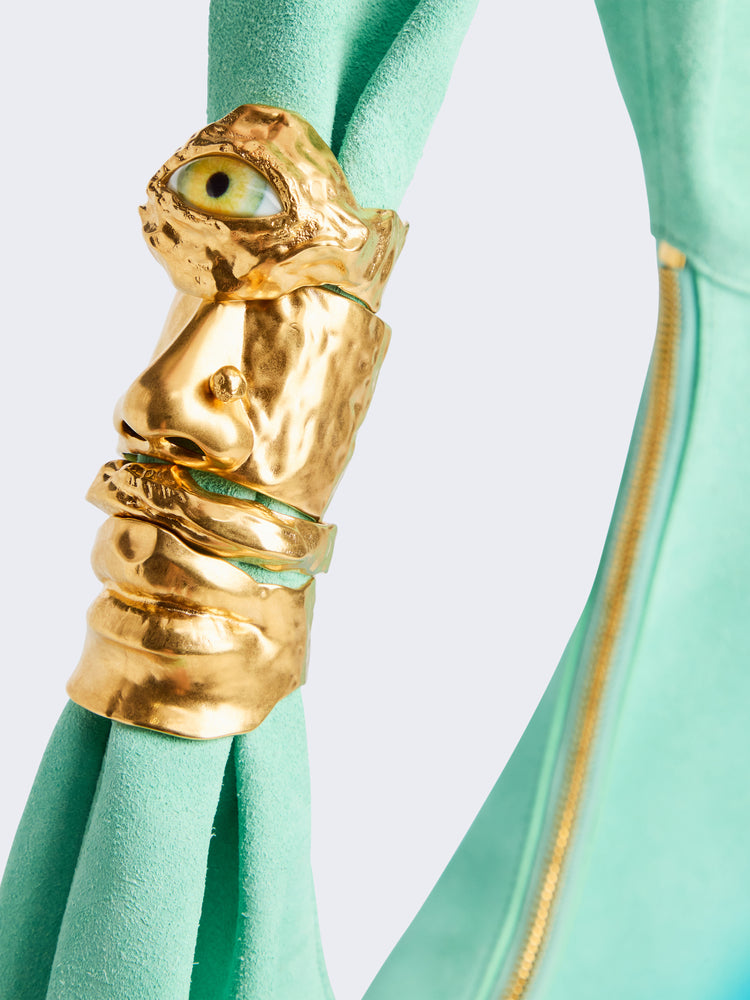 This small Soufflé bag in turquoise suede has been spray-painted by hand to create this glossy blue gradient effect. It is embellished with charms in hammered gold brass forming a face on the handle.