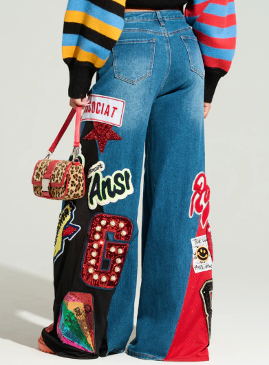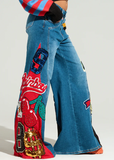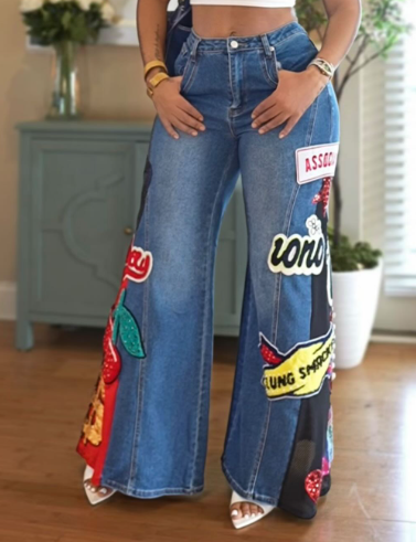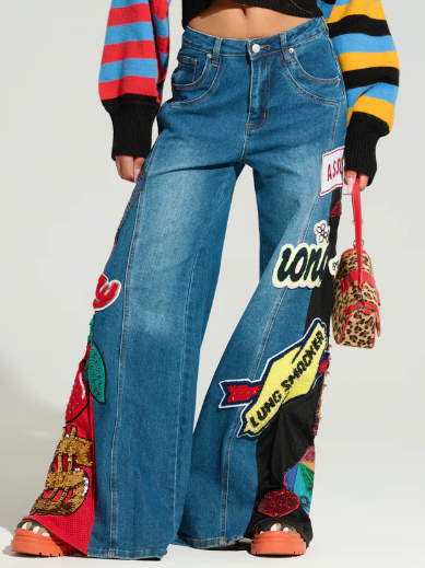Love these embroidered patch jeans! The wide-leg silhouette is so flattering and fun to style.
